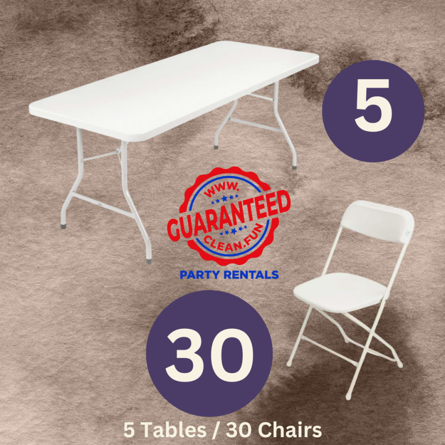 Step up your event planning game in Katy, Texas, with our exquisite table and chair rental service. Our collection, featuring a stunning 30 Pack of White, Clean, and Classy Chairs along with 5 Rectangular Six-foot Tables, is the ideal choice for any event, be it a lavish wedding, a high-profile business conference, or a laid-back backyard get-together.
