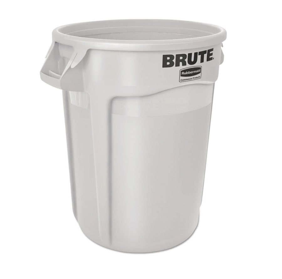 This round white 44 gallon trash can is built tough to survive rough handling and rugged environments. It meets industry regulations and criteria for safe waste and material handling. The trash can has a UV stabilizer added for maximum life in outdoor settings. Its all-plastic professional grade construction will not rust, chip or peel and resists dents. The trash can is stackable with other containers for efficient storage. Built-in, heavy-duty handles provide non-slip lifting and carrying of heavy loads, while the reinforced rims add strength and durability. The waste container's double-ribbed base increases stability and dragging capacity. This white trash can is USDA Meat & Poultry Equipment Group Listed and assists in complying with HACCP guidelines.