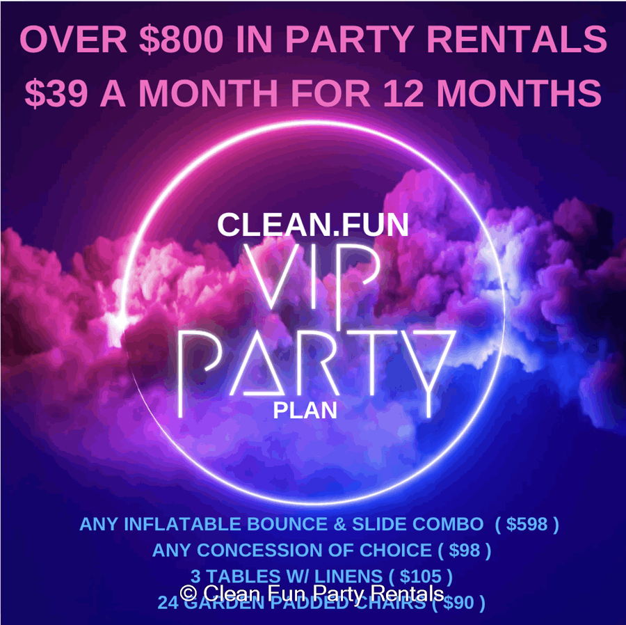 The Clean Fun VIP Party Plan is your solution to getting everything you want & need but at the lowest possible price. Over $800 in rental equipment is included. Add a cake, drinks & food and your all set for party success.